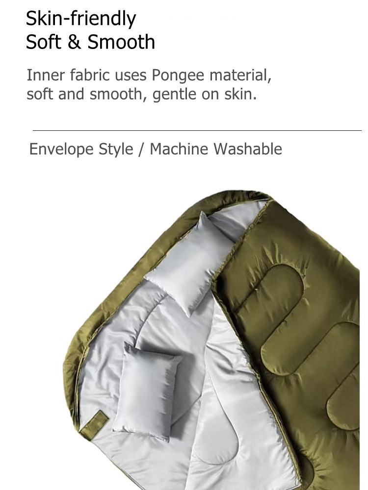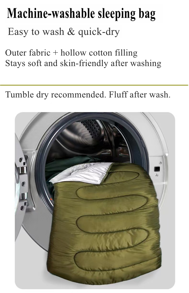 The sleeping bag fabric has a high density. For dust, simply wipe it off with a dry towel. Small oil stains can be spot-cleaned by brushing. The filling is polyester fiberfill, so it can be machine washed in a front-loading washing machine. It is advisable to wash the sleeping bag in dry weather. After washing, turn the bag inside out (the lining is highly breathable) to dry. Ensure it is completely dry, then pat and shake it to evenly distribute the cotton filling.