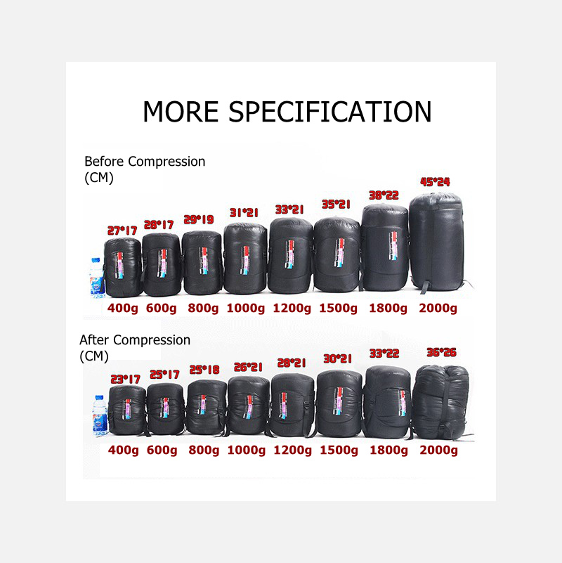 pecifications: 210*80*50 cm Filling: Goose down fiber (Customizable down type) Shell Fabric: Nylon Lining: Nylon Structure: Mommy-style Filling Weight: 500 g – 1500 g Color: Customized